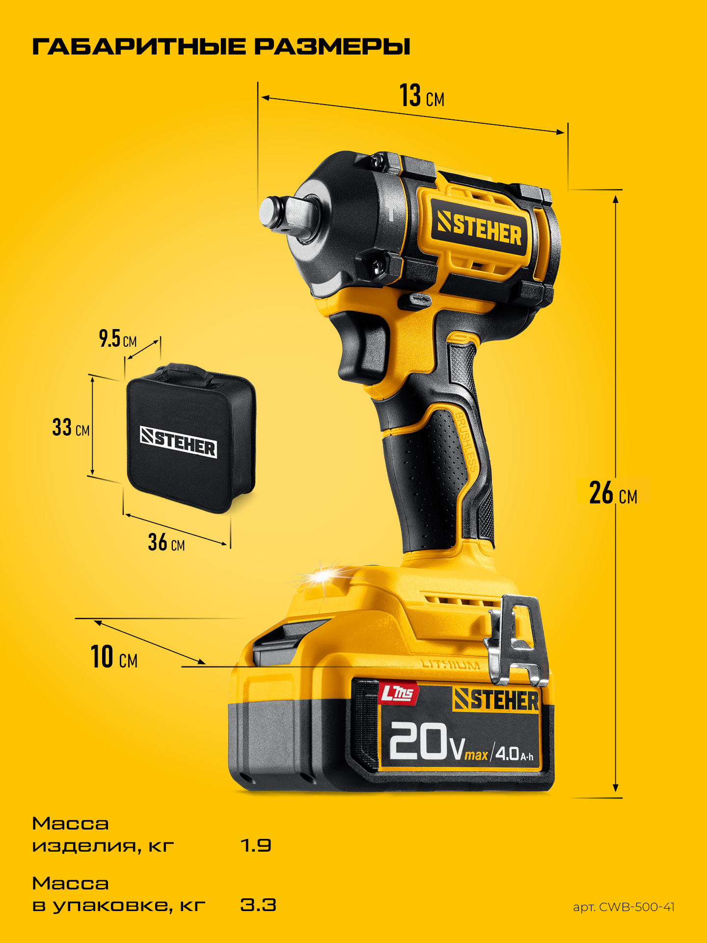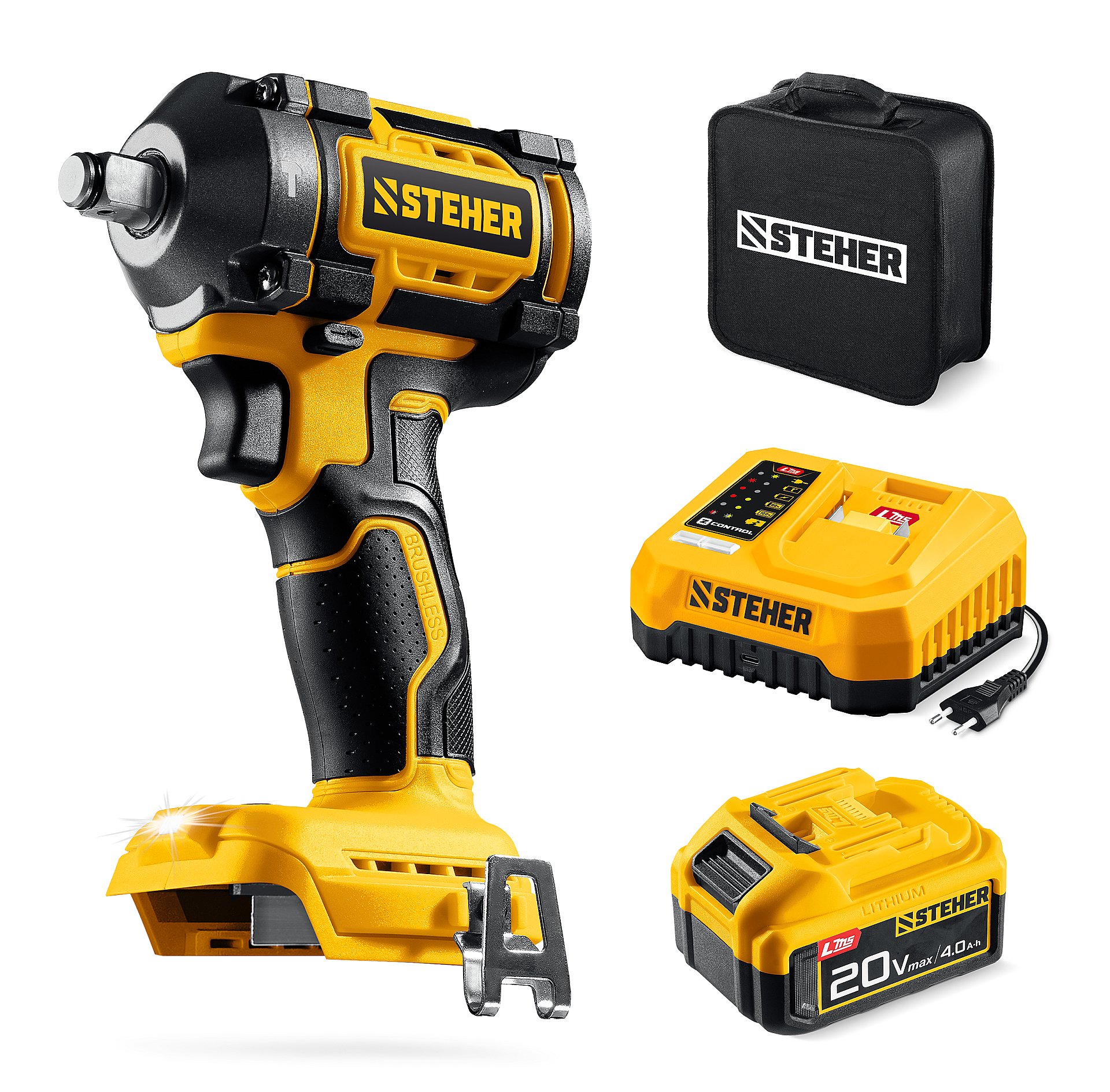 Бесщеточный ударный гайковерт Steher с BRUSHLESS двигателем и максимальным крутящим моментом 500 Н∙м предназначен для фиксации резьбовых соединений размером до М22. Ударная функция с эффективным направлением удара обеспечивает легкое заворачивание без лишней нагрузки на кисть оператора. Имеет современную аккумуляторную систему LMS с 1 АКБ в комлекте, совместимую с одним известным брендом.