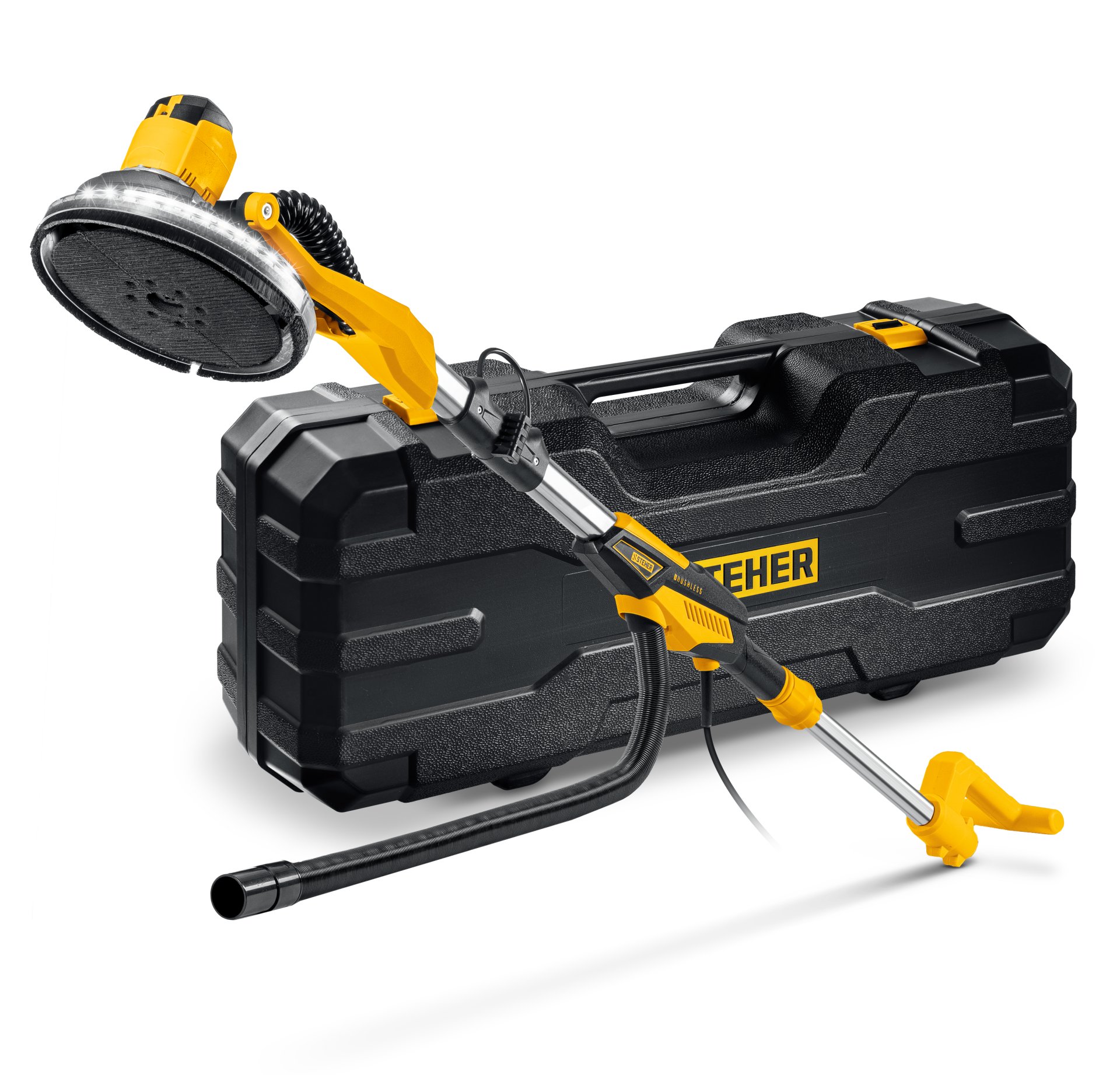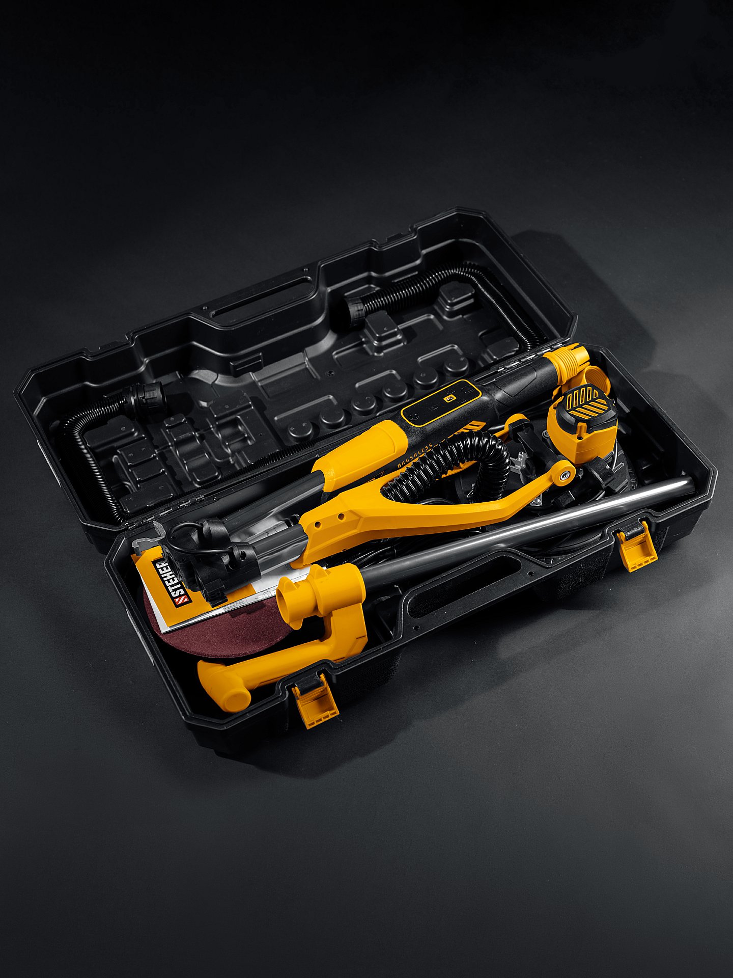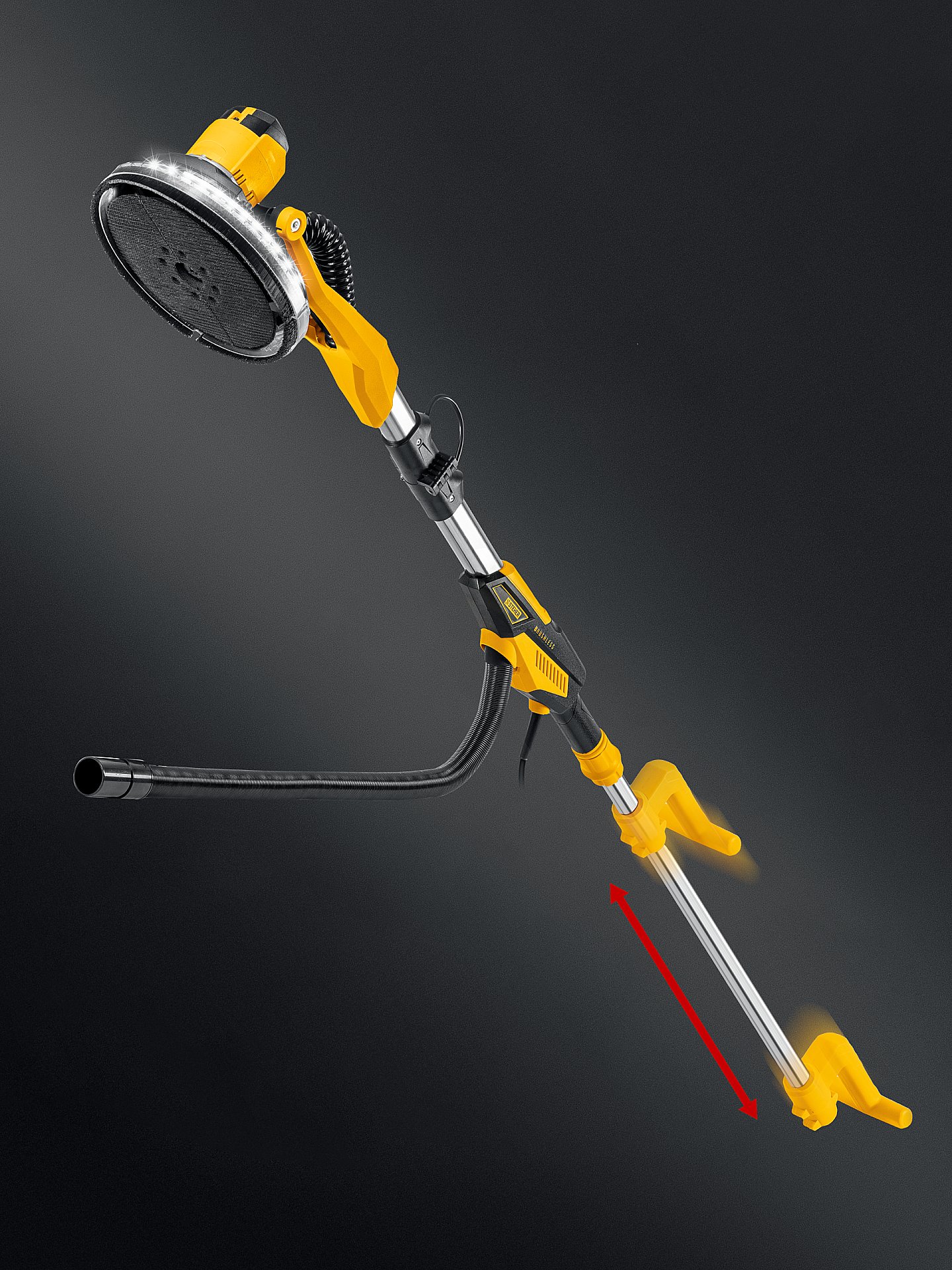 Машина шлифовальная для стен (жираф) с бесщеточным BRUSHLESS двигателем - незаменимый инструмент для обработки как горизонтальных, так и вертикальных поверхностей при подготовке к окраске или поклейке обоев. Облегченная конструкция и высокая надежность благодаря малогабаритному и высокотехнологичному двигателю, не требующему обслуживания