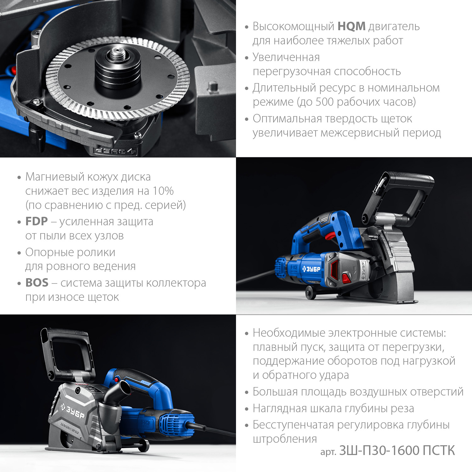 Профессиональный штроборез ЗУБР для выполнения штроб глубиной до 30 мм в легких бетонах. Расширенная (по сравнению с ЗШ-П30-1600 ПСТ) комплектация включает удобный кейс для хранения и переноски. Легкость и компактность позволяют длительно держать его на весу при работе на вертикальных поверхностях