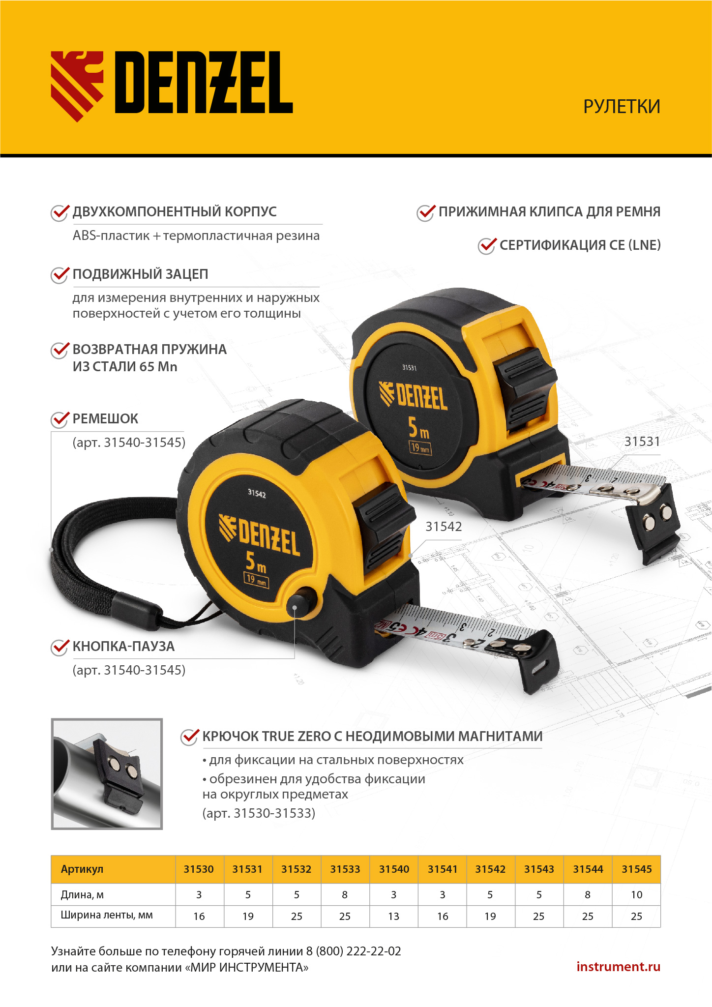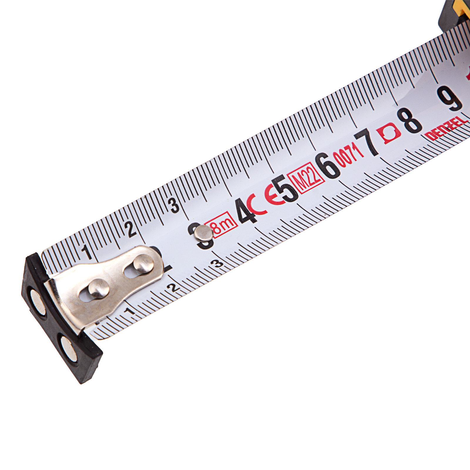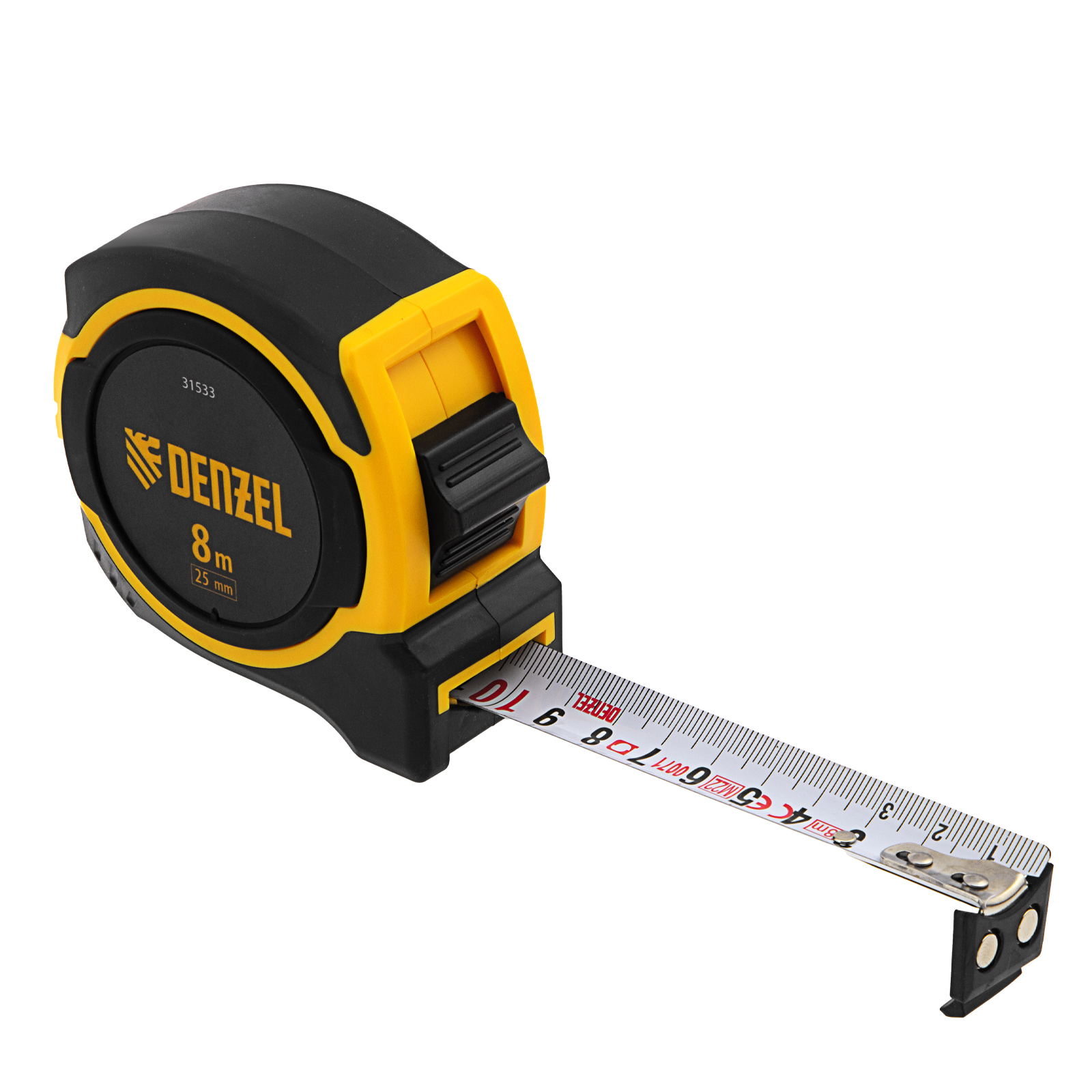Рулетка Denzel 31533 в двухкомпонентном корпусе, с измерительной лентой шириной 25 мм и магнитным обрезиненным зацепом, позволяет определять размеры предметов и расстояния до 8 м. Широкая упругая лента упрощает проведение измерений в труднодоступных местах. Рулетка будет полезна во время строительных, ремонтных и различных бытовых работ.