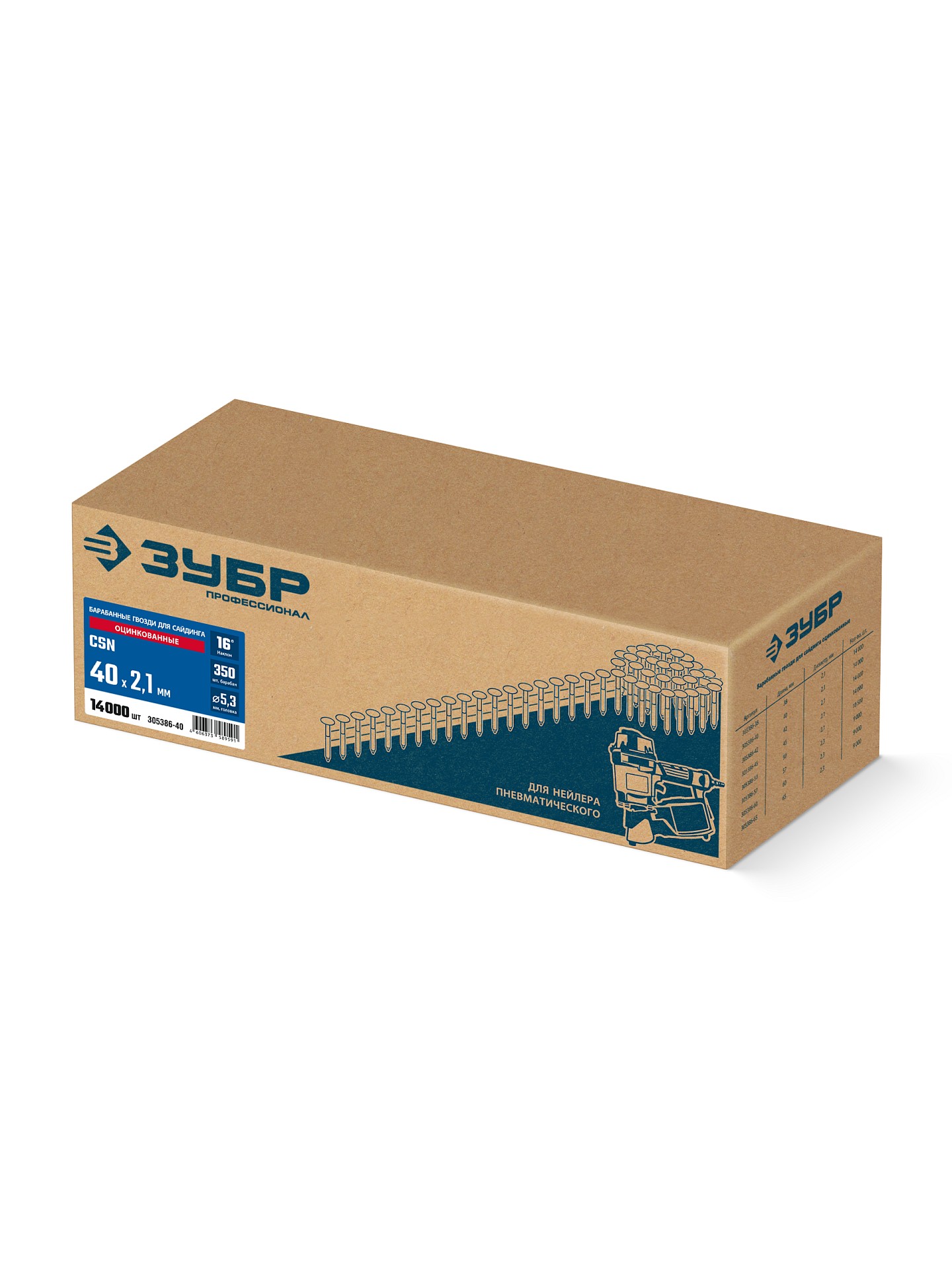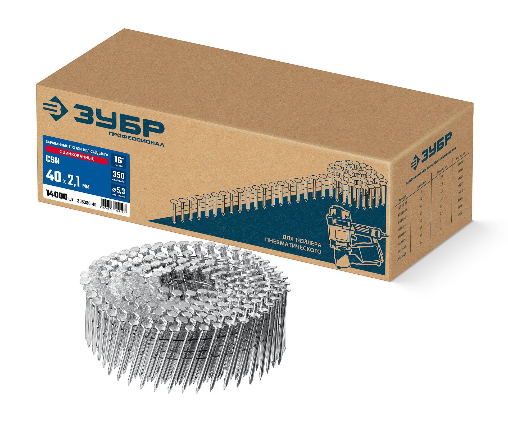 Барабанные гвозди для сайдинга оцинкованные CSN 40 х 2.1 мм 14000 шт Зубр 305386-40 фото