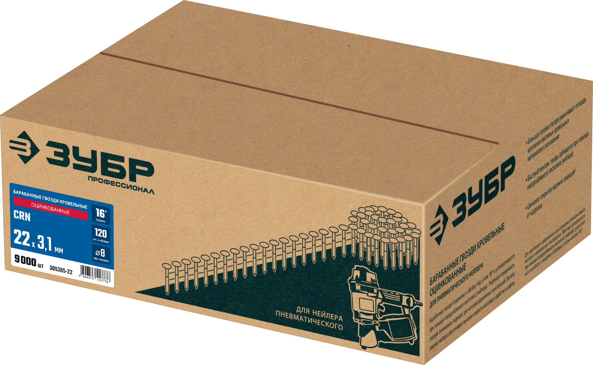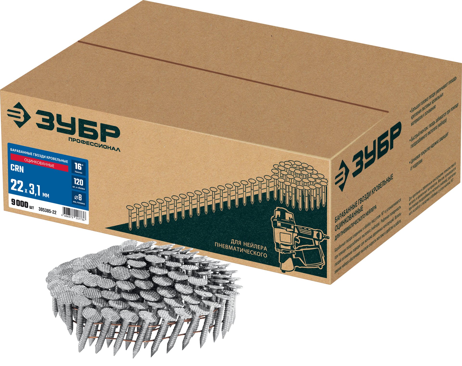 Барабанные гвозди кровельные оцинкованные CRN 22 х 3.1 мм 9000 шт Зубр 305385-22 фото