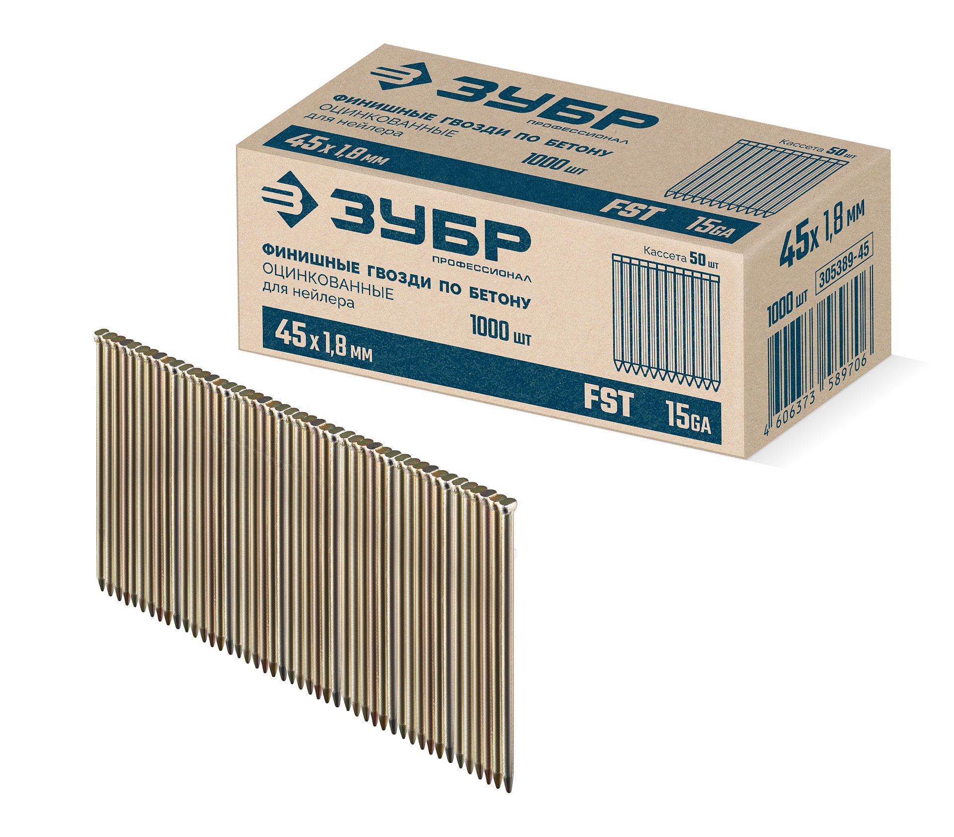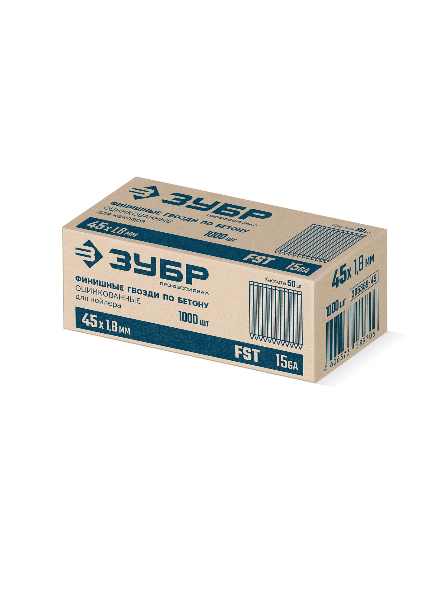 Реечные финишные гвозди по бетону оцинкованные калибр 15GA FST 45 х 1.8 мм 1000 шт Зубр 305389-45 фото
