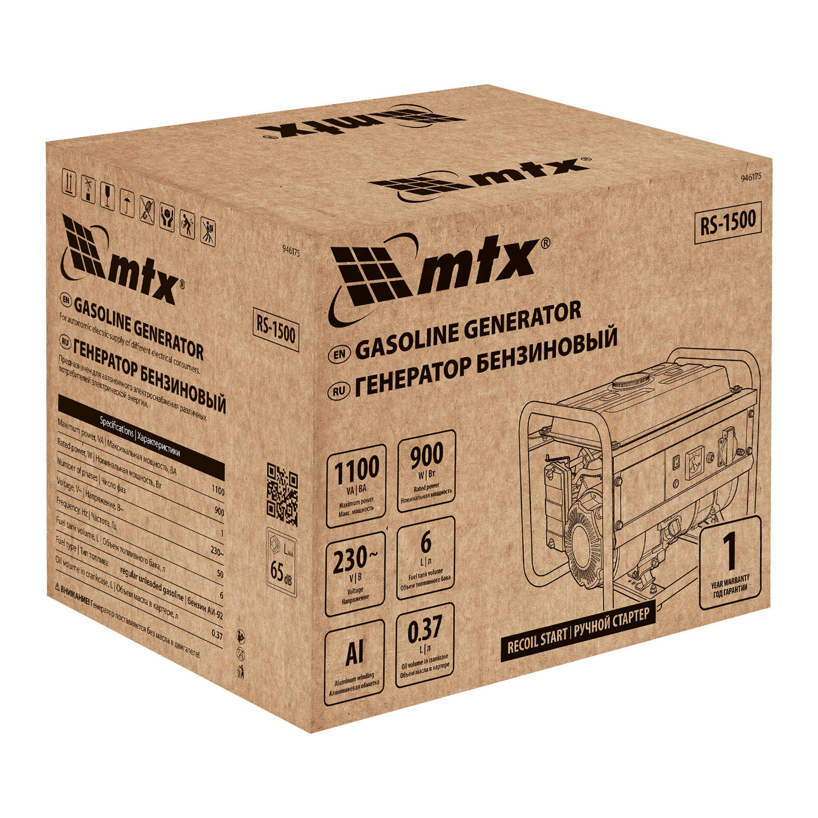 Бензиновый генератор MTX RS-1500 946175 максимальной мощностью 1,1 кВт, с ручным стартером, вырабатывает переменный ток с напряжением 230 В и служит резервным источником питания для бытовой техники, электроинструмента, осветительных приборов и т.п. Незаменим в условиях отсутствия бытовой электросети. Для подключения потребителей предназначена розетка 230 В/16 А. Защитная крышка предотвращает попадание внутрь пыли и влаги. Автоматический регулятор напряжения (AVR) позволяет обеспечивать питанием чувствительные приборы без риска их выхода из строя. Генератор пригодится на даче.