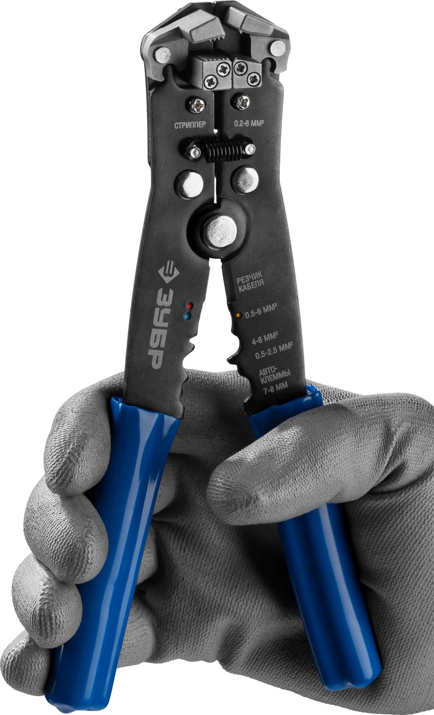 ТТ-3 стриппер автоматический многофункциональный, 0.2 - 6 мм2, ЗУБР Профессионал. Позволяет безопасно и без повреждений проводника снимать изоляцию с многожильных и многопроволочных кабелей. Также изделие удобно для снятия изоляции с плоских проводов. Стриппер оснащен прижимными губками, которые изготовлены из высокопрочной стали. Автоматическое снятие изоляции 0,2-6 мм?. Кусачки для кабеля. Обжим изолированных наконечников 0,5-6 мм?, неизолированных наконечников 0.5-2.5, 4-6 мм. Обжим автомобильных клемм 7-8 мм.