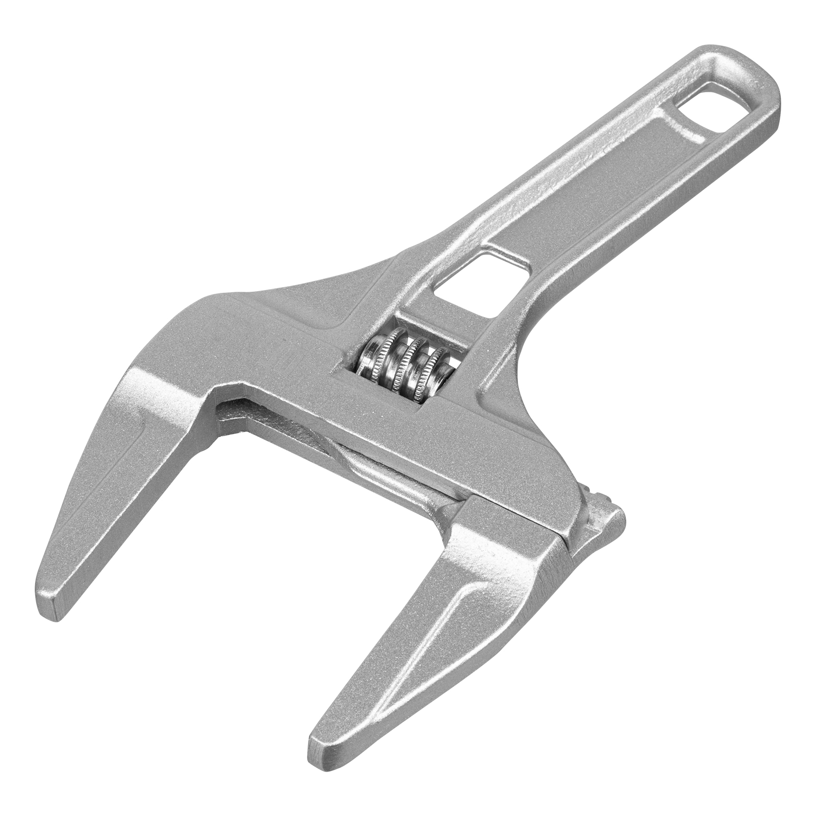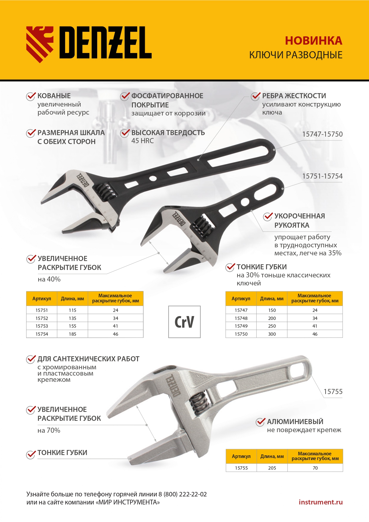 Ключ разводной алюминиевый Denzel 15755 длиной 205 мм, с тонкими губками, оптимален для монтажа и демонтажа хромированных и пластмассовых крепежных элементов. Используется при выполнении сантехнических работ.