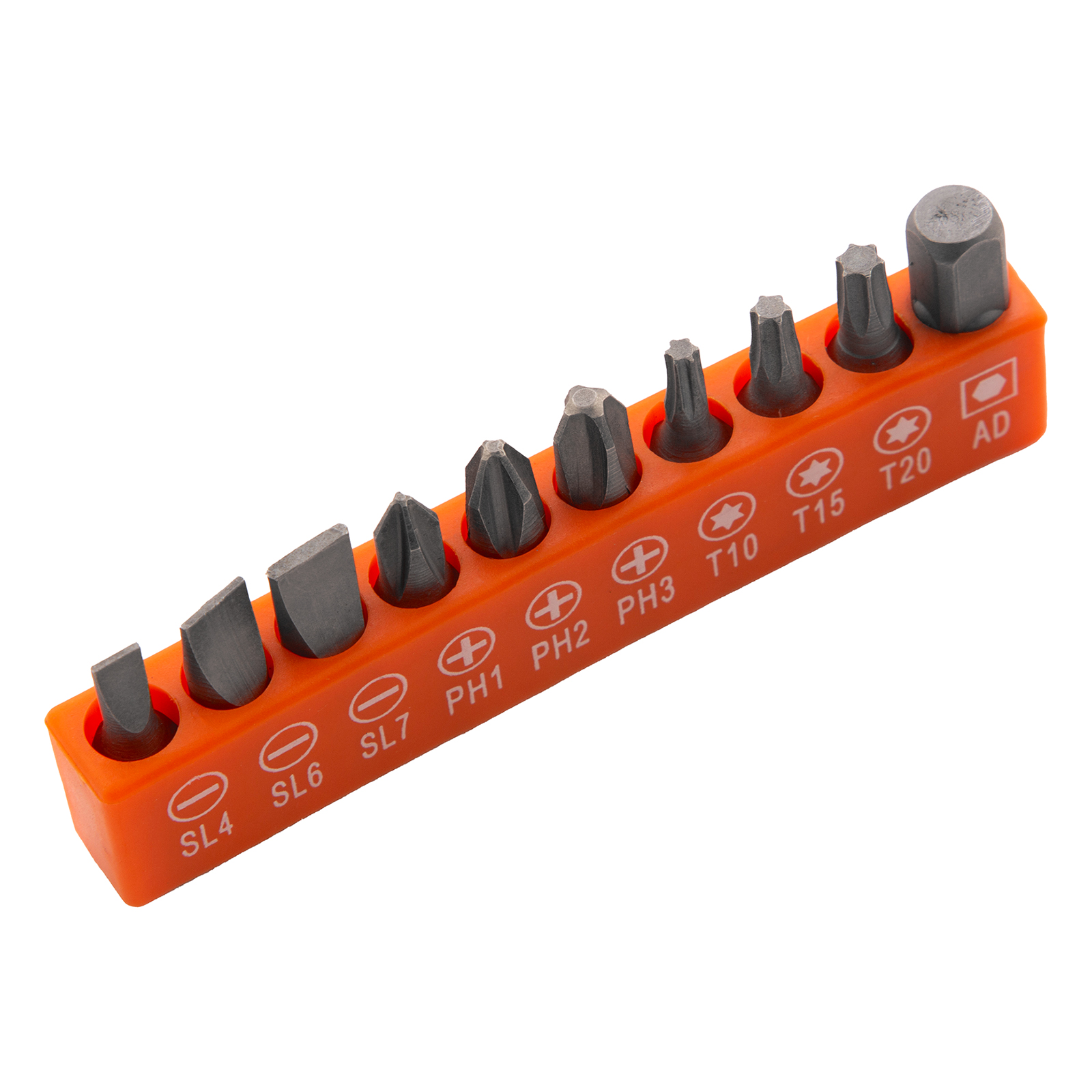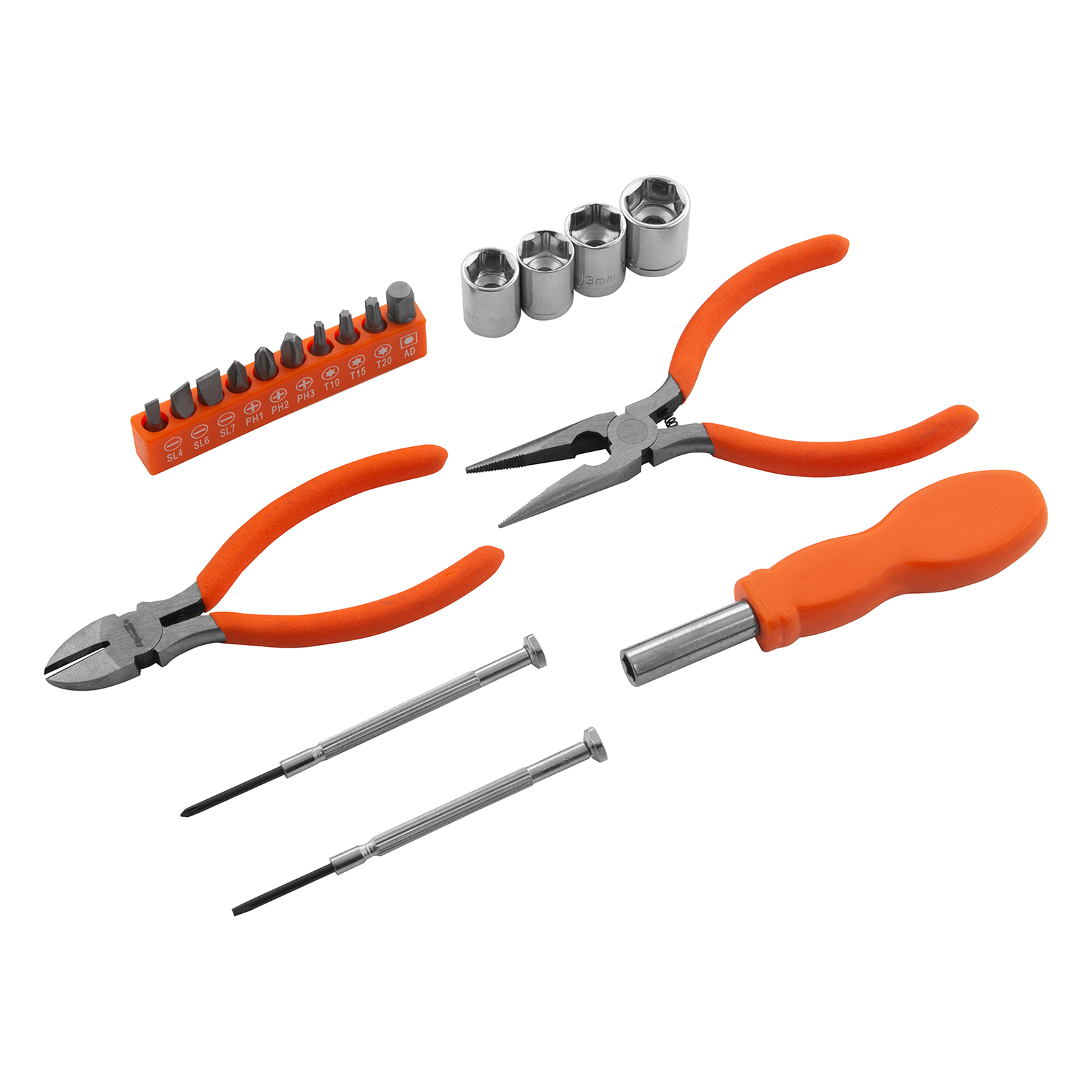 Длинногубцы - 1 шт, Бокорезы - 1 шт, Головки 11, 12, 13, 14 - 4 шт, Отвертки для точных работ SL, PH - 2 шт, Отвертка для бит - 1 шт, Адаптер для бит - 1 шт, Биты PH, SL, T - 9 шт, Кейс - 1шт