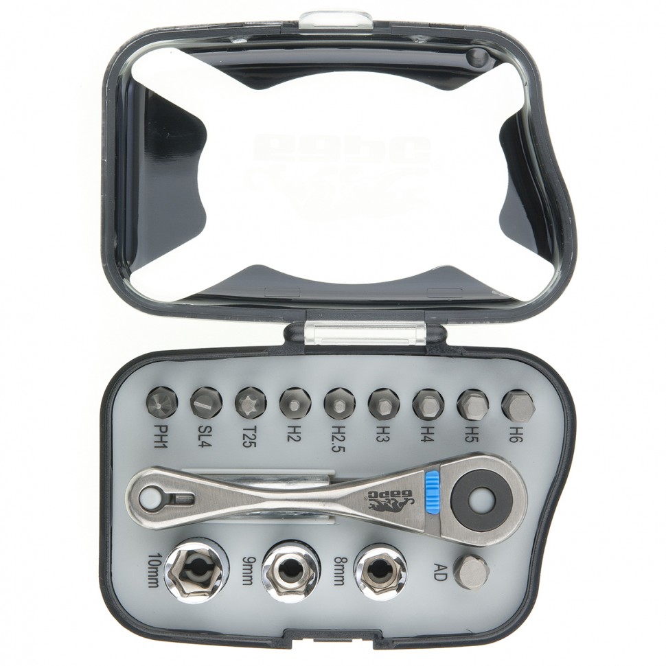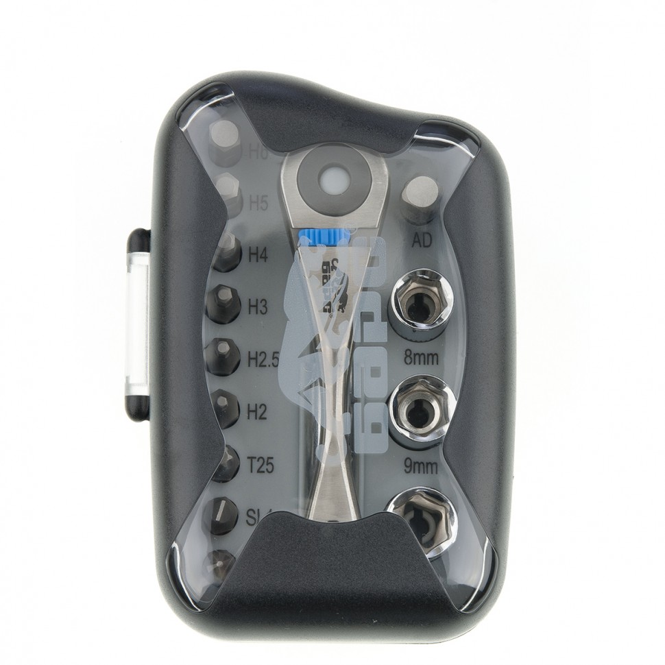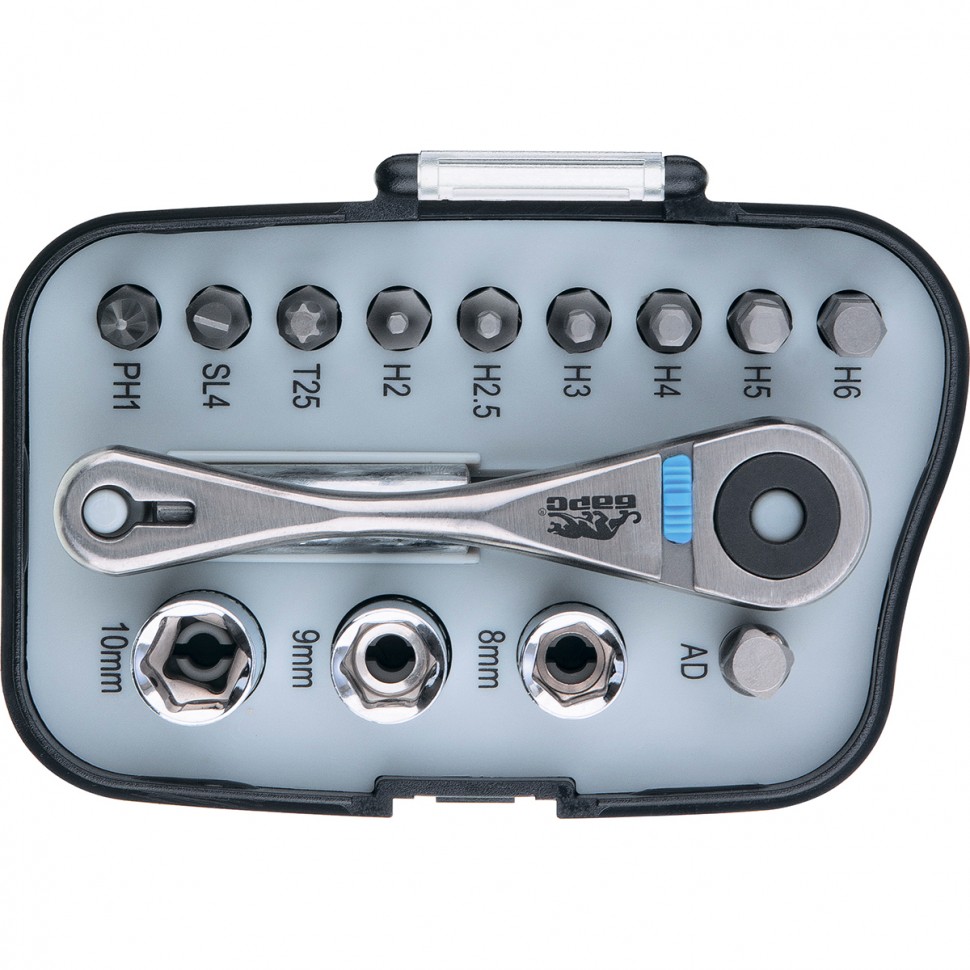 Трещотка с набором бит, изготовленных из хромованадиевой стали.Реверсивный механизм позволяет заворачивать и отворачивать крепеж, не перехватывая ручку.ОсобенностиСталь CrV.Твёрдость бит - 60 HRC.