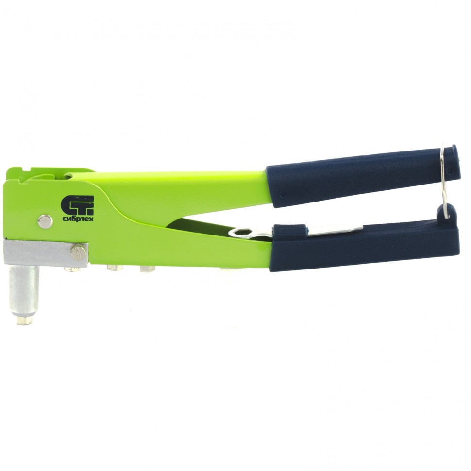 Заклепочник Сибртех 40543, 270 мм, работает с заклепками диаметром 2,4-3,2-4,0-4,8 мм и обеспечивает прочное соединение листовых металлических заготовок. Он станет незаменимым помощником для частных и профессиональных мастеров. Заклепочником удобно работать в труднодоступных местах, т.к. его рабочую часть можно переставлять на 90 градусов. Заклепочник изготовлен из стали методом штамповки, это обеспечивает его прочность и надежность. ПВХ-рукоятки снижают риск проскальзывания инструмента в руке. Заклепочник полностью готов к работе — комплект включает насадки для заклепок и ключ для их замены. Скоба для фиксации рукоятки делает более удобными и безопасными хранение и транспортировку заклепочника.