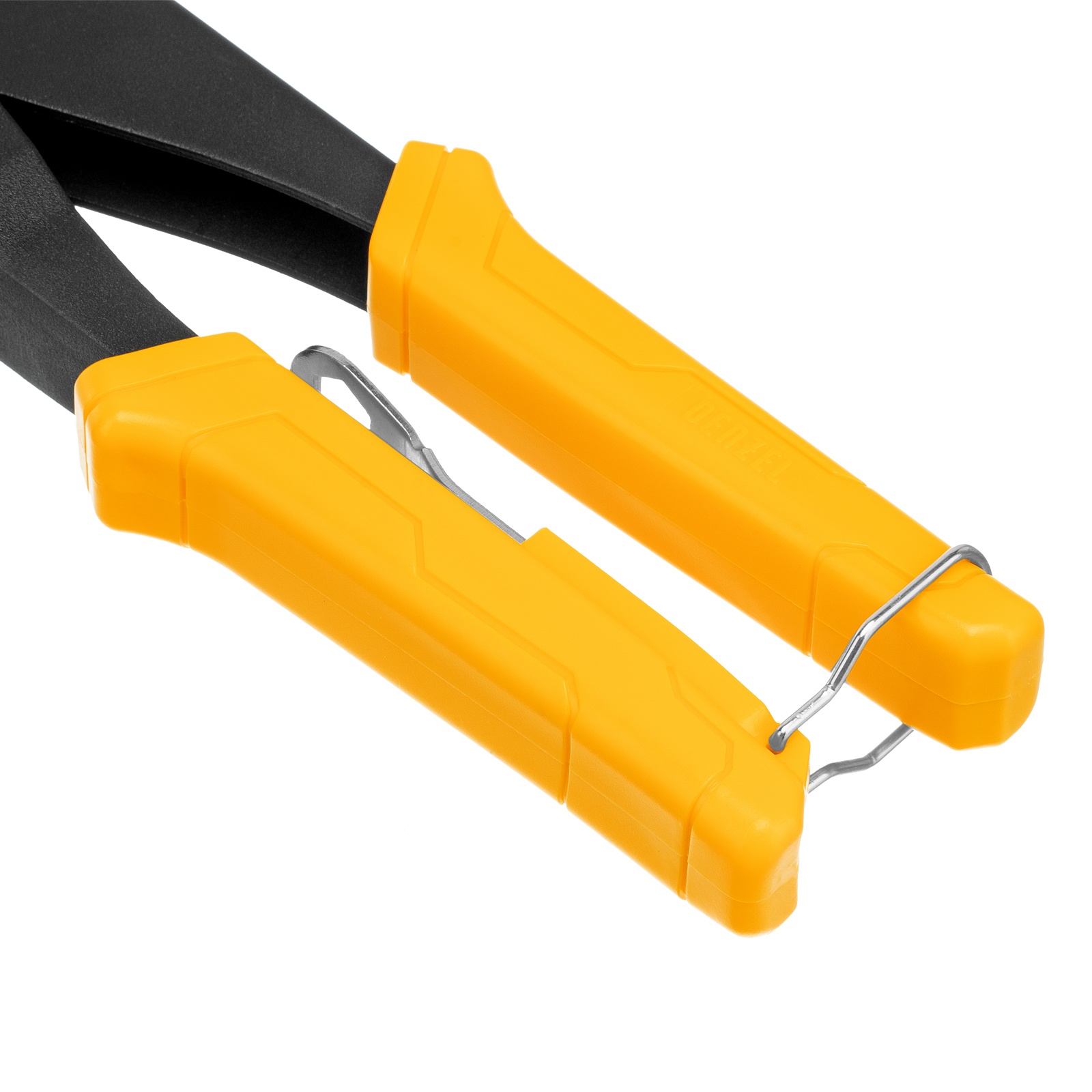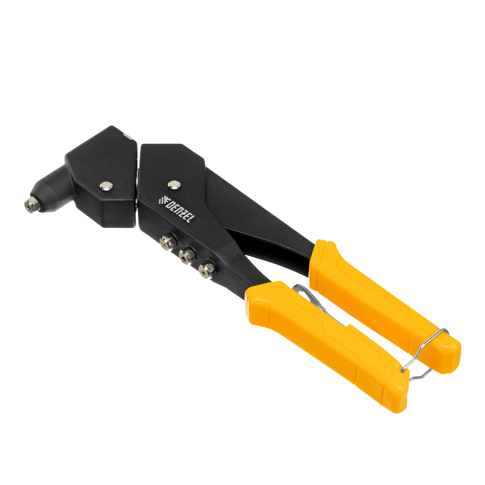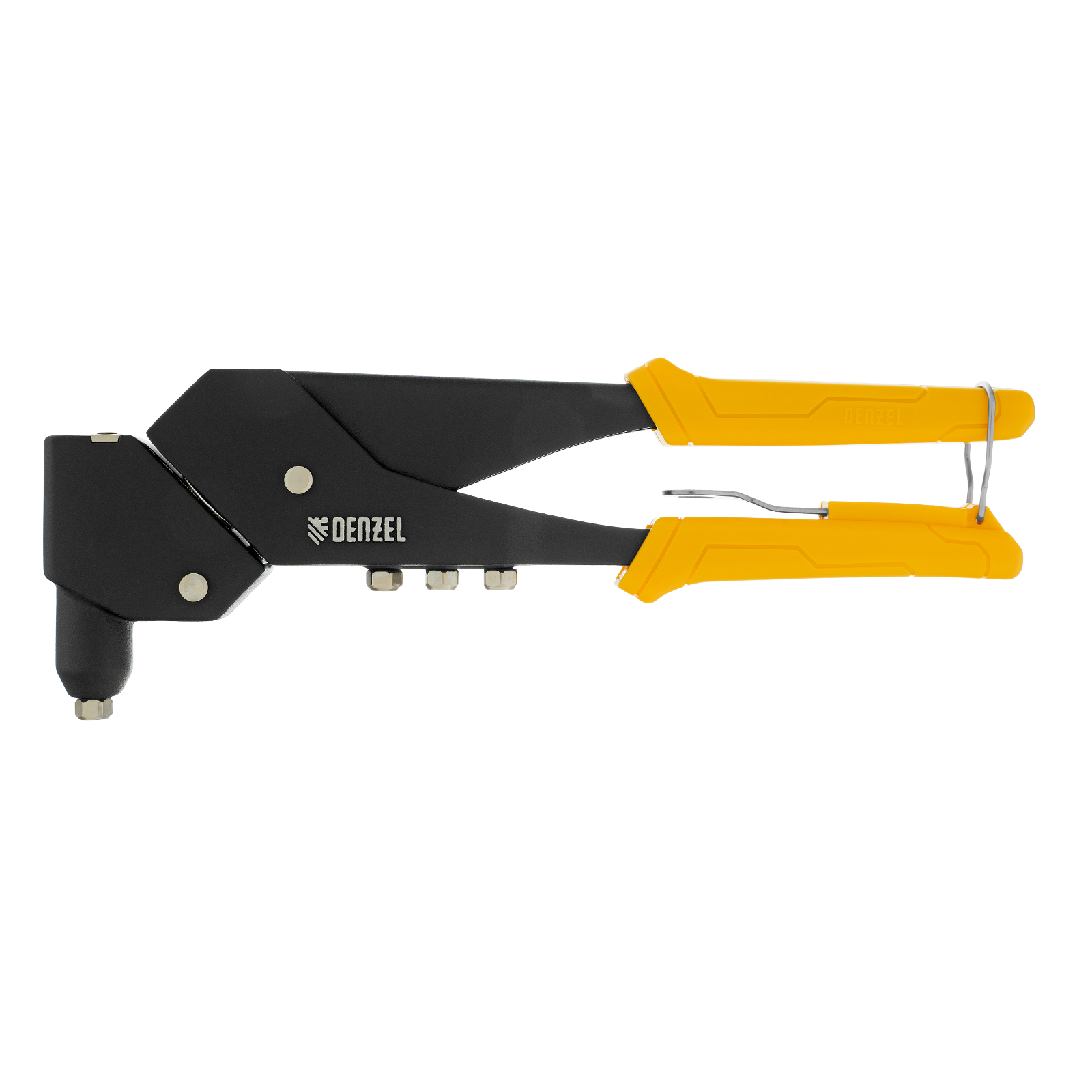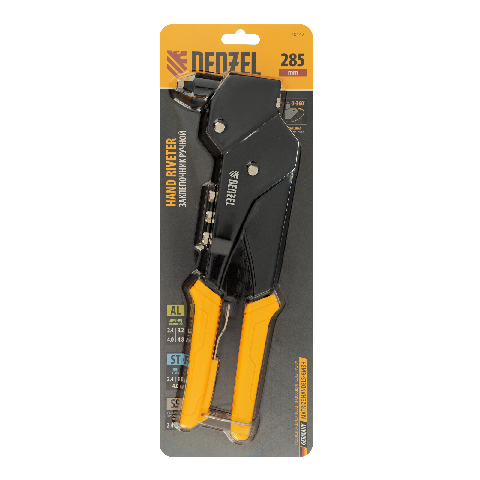 Заклепочник ручной литой Denzel 40442 длиной 285 мм, поворотный на 0-360°, используется для создания неразъемных соединений с помощью алюминиевых вытяжных заклепок диаметром 2,4-3,2-4,0-4,8 мм, стальных диаметром 2,4-3,2-4,0 мм и вытяжных заклепок из «нержавейки» диаметром 2,4-3,2 мм. Голова инструмента вращается на 360°, что упрощает работу в стесненных условиях. Заклепочник пригодится на производстве, в ремонтной мастерской, а также в быту. Прочность и долговечность — корпус из алюминиевого сплава устойчив к механическим нагрузкам. Надежность — трехсегментный цанговый механизм из прочной стали 35Х крепко удерживает вытяжную шпильку заклепки. Безопасность — фиксатор рукоятки предотвращает случайное срабатывание инструмента во время транспортировки и позволяет сэкономить место для хранения. Готовность к работе — в комплект поставки включены сменные головки для заклепок разного размера и ключ для замены насадок. Продуманное хранение сменных насадок — головки крепятся на корпус, поэтому они всегда будут под рукой и не потеряются. Комфортная работа — эргономичные рукоятки с рельефной поверхностью надежно ложатся в руку.